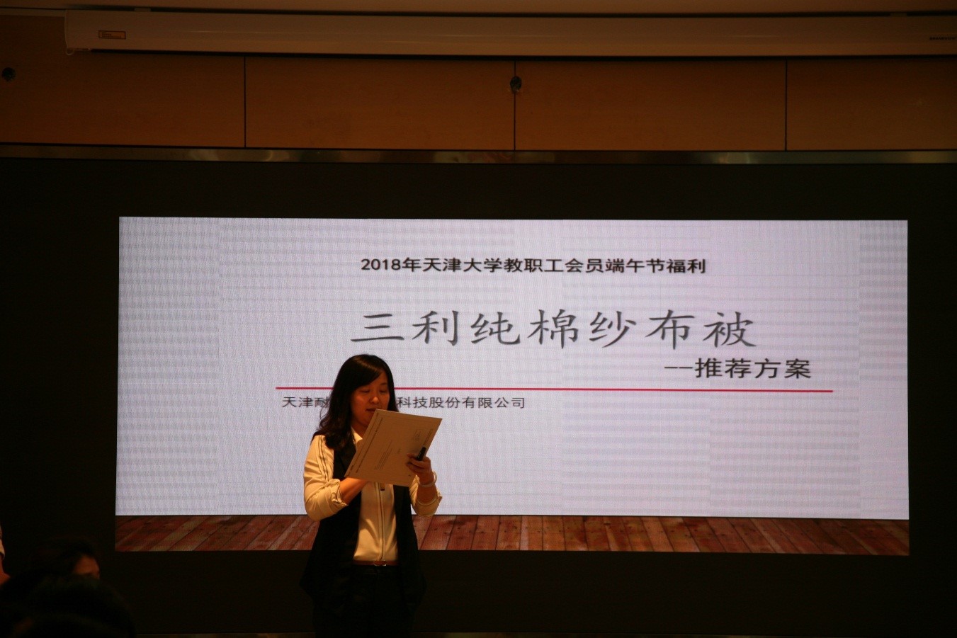 按照以教职工需求为导向,以基层单位意见为指引,主动服务教职工的工作理念,校工会前期面向全校教职工会员广泛征询2018年全年节日慰问品发放意见,根据征询结果选定“纯棉纱布被”为端午节福利发放的产品。通过面向社会进行公开招募,此次遴选会吸引了来自天津、河北等地的10家供应商报名参加。
