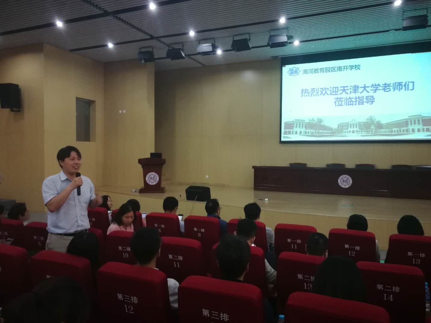 5月22日,由校工会、青年教师联谊会与海教园南开学校联合举办的天津大学青年教师“走进系列”活动之二十一——“走进海教园南开学校”活动在海教园南开学校举行。海教园南开学校校长张国发、副校长吕梅,天津大学工会挂职副主席陈乐、青年教师联谊会副理事长苏荣欣,天津大学各院级单位50余名青年教师及海教园南开学校30余名青年教师共同参与活动。