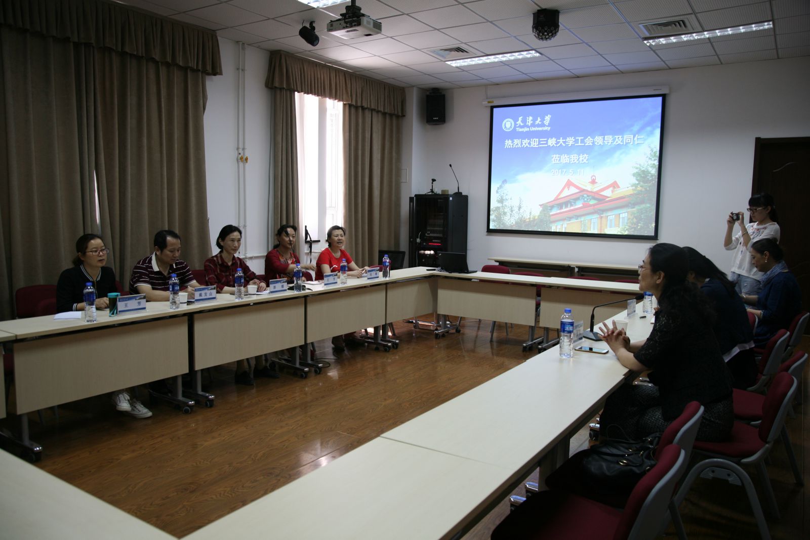 郭穗对天津大学工会的热情接待表示感谢,并介绍了三峡大学工会相关工作。座谈会上,双方围绕工会服务教职工的工作体系和平台建设等内容进行深入探讨,并就青年教职工、女工工作,教职工文体协会的管理运行以及校院两级教代会如何运行等问题深入交换了意见。双方在交流和讨论中都很受启发,在交流和学习中不断提升工作能力和素质。