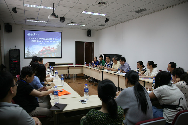 6月13日下午,天津市教育工会张家翔一行来我校进行工作调研。天津大学党委副书记、纪委书记、工会主席汪曣参加了调研和座谈。会议由工会常务副主席马桂秋主持,人事处、后保部、内燃所、设计总院的代表参加此次调研活动。