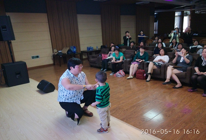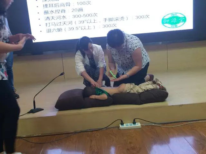 在讲座中,王津从小儿发烧、积食、咳嗽等话题出发,为老师们细致的讲解了相关中医知识及海派小儿推拿手法,来自学校幼儿园的龙龙小朋友作为神秘嘉宾,扮演了一次“真人模特”,协助王津医师让大家体验了小儿推拿的实际操作,加深了老师们对小儿推拿的理解和感受。