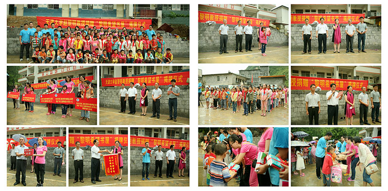 作为百色实践营的重要学习实践环节之一,营员们号召发起了对黎明希望小学的系列捐赠。短短三天内,共募集书籍800多册(其中逾1/3为新购置书籍)、文房四宝20套(由天津大学建筑设计规划研究总院捐赠)。此外,还成功联系到校内相关组织和个人对黎明希望小学的10位家庭经济困难学生进行资助。此次对黎明希望小学的帮扶还促成了井冈山营、延安营、韶山营、遵义营、百色营等五期优秀青年教师实践营的“成功会师”,每期实践营分别资助贫困生一名,每期实践营还为小朋友们精心准备了亲笔写有寄语的卡片、明信片、书籍等礼物。营员们共同约定,将长期资助贫困学生直到高中毕业,成为实践营成员之间的情感联系纽带。此外,校工会还购置了近3000元文具捐赠给小学生。