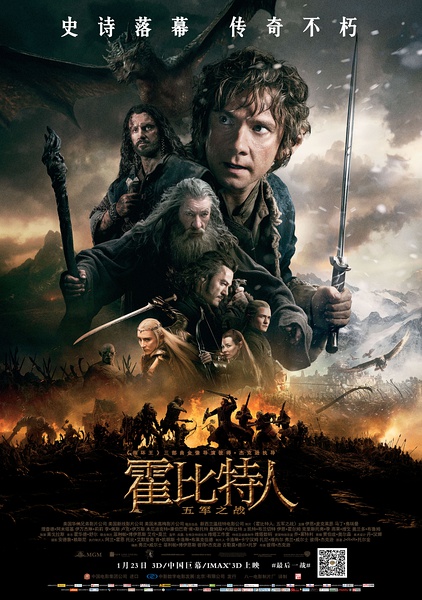 周五(3月27日)晚7点半放映《霍比特人:五军之战》(The Hobbit: The Battle of the Five Armies)。该片是彼得·杰克逊执导的《霍比特人》系列魔幻冒险电影的最终章,改编自托尔金小说,由华纳兄弟影片公司、新线电影公司 、 米高梅电影公司联合出品,马丁·弗瑞曼、伊恩·麦克莱恩、理查德·阿米蒂奇、本尼迪克特·康伯巴奇主演。影片讲述比尔博·巴金斯和同伴被迫卷入一场反抗大军的战争,同时必须阻止恐怖的史矛革巨龙夺取王国的宝藏和毁灭整个中土世界。