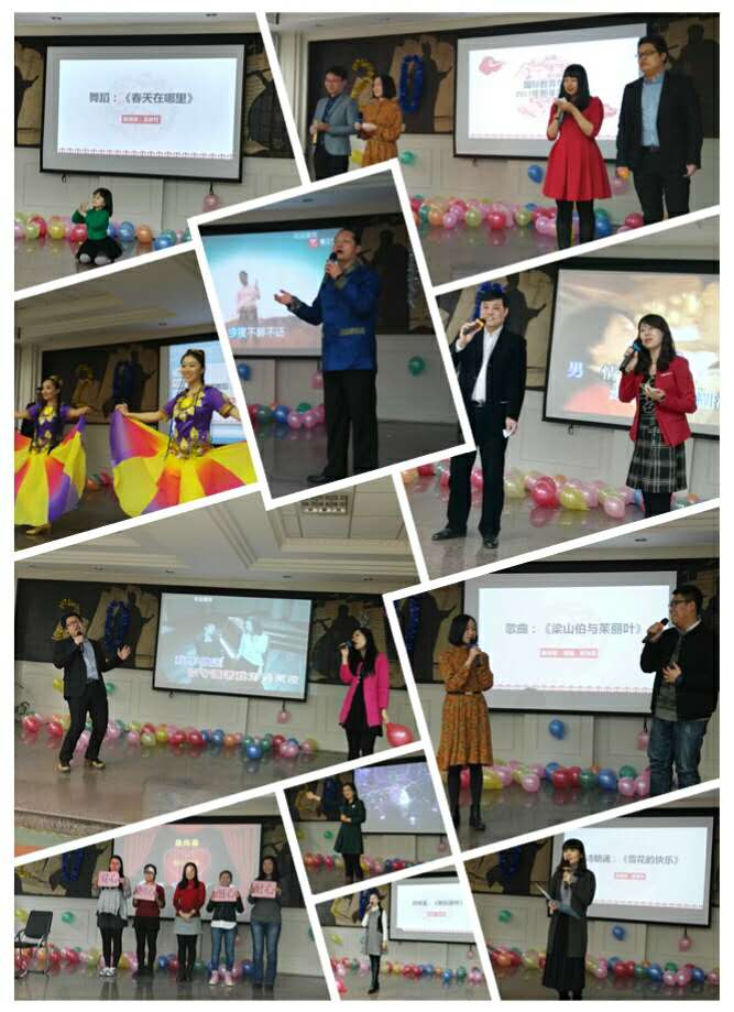 联欢活动在国际教育学院副院长兼工会主席杜修平的新年致辞中拉开帷幕。开场舞蹈《掀起你的盖头来》中两位老师优美动感的舞姿点燃了现场的热烈气氛;由汉语国际教育系马知遥老师带来的独唱《鸿雁》气势磅礴,意境悠远,引人入胜;院办张曦予老师带来的诗朗诵《雪花的快乐》让现场观众感受到了冬季的不同魅力;两位年轻老师张璐和翟洪源的合唱《梁山伯与茱丽叶》给活动现场注入了一股青春活力;由预科部李琳老师带来的太极拳表演让观众们被博大的中国文化所震撼;由来华事务科冯宝平老师和预科部董杰老师共同演唱的《糊涂的爱》旋律优美,感情充沛;教务科全体表演的小品《教务办公室的日常》,搞笑的台词和默契的配合使现场气氛轻松活泼……联欢活动总共有十八个精心编排的节目,期间观众们边用餐边观看节目,时时爆笑,每个人都感受到节日的喜悦之情。