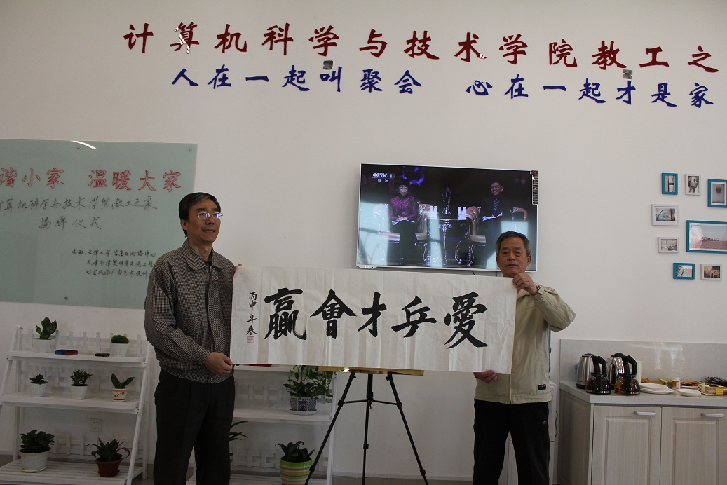 随后,校工会办公室主任时莹老师和学院党委书记宋俊启共同为教工之家揭牌,退休教师郝嘉林老师为教工之家献上“爱乒才会赢”的墨宝,表示祝贺。