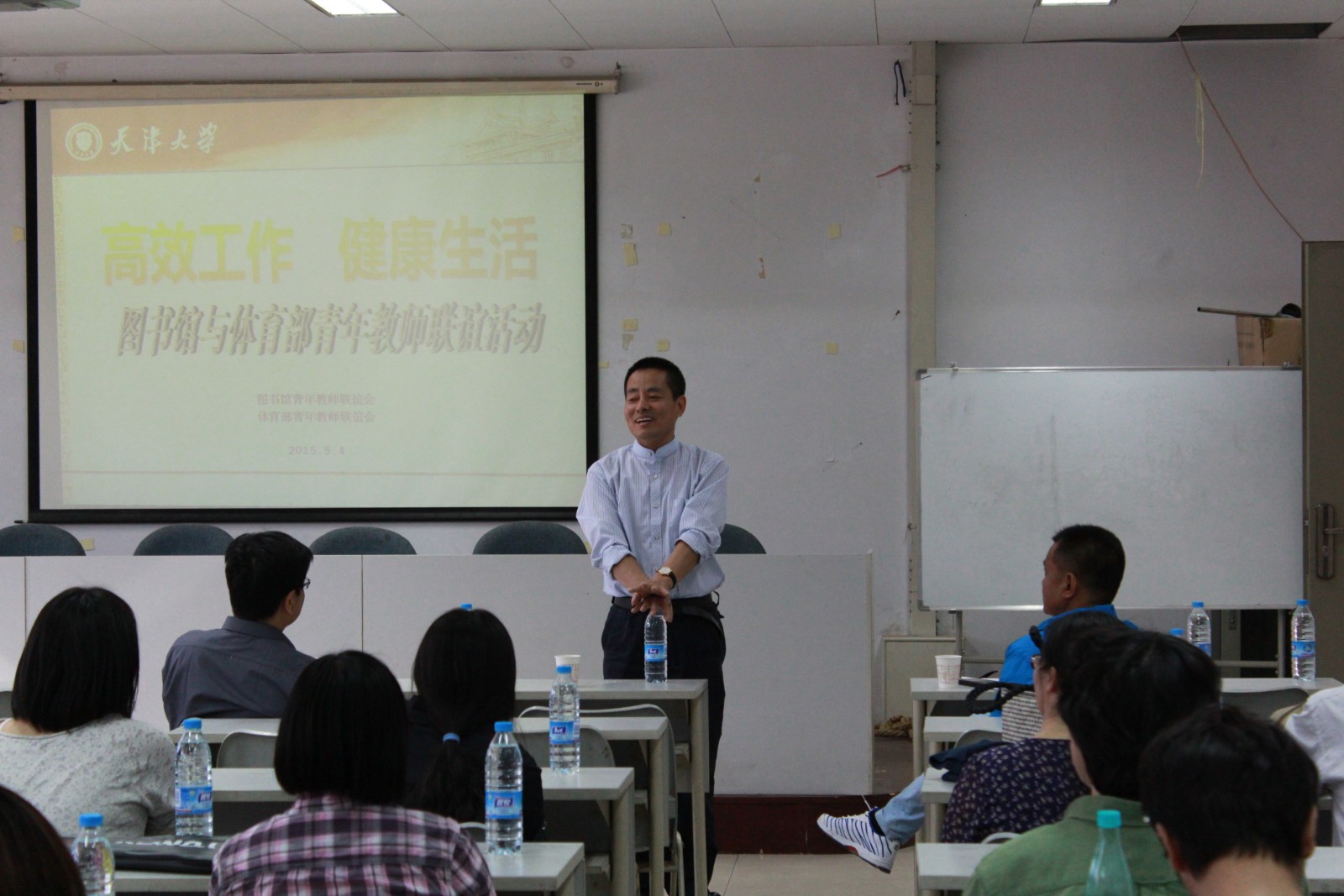 2015年5月4日下午,在欢庆五四青年节之际,天津大学体育部与图书馆举行了一场以“高效工作、健康生活”为主题的青年教师联谊活动。图书馆党总支书记马小宝、体育部党总支书记韩文俊、副主任屈连朋、以及校工会副主席文莉老师都出席了活动,与青年教师一起共度节日。本次活动共吸引了40多名青年教师参加。