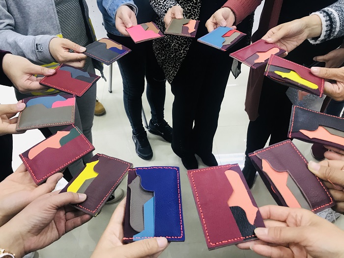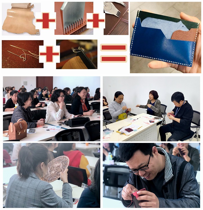 本次活动是校工会“多彩之日”示范立项之一。活动邀请皮具制作老师讲解皮料、皮雕、植鞣革、铬鞣革的加工工艺和流程,并指导教职工们现场制作。大家亲自动手,穿针引线,缝制出精美的卡包,享受着纯手工“高定”的乐趣。