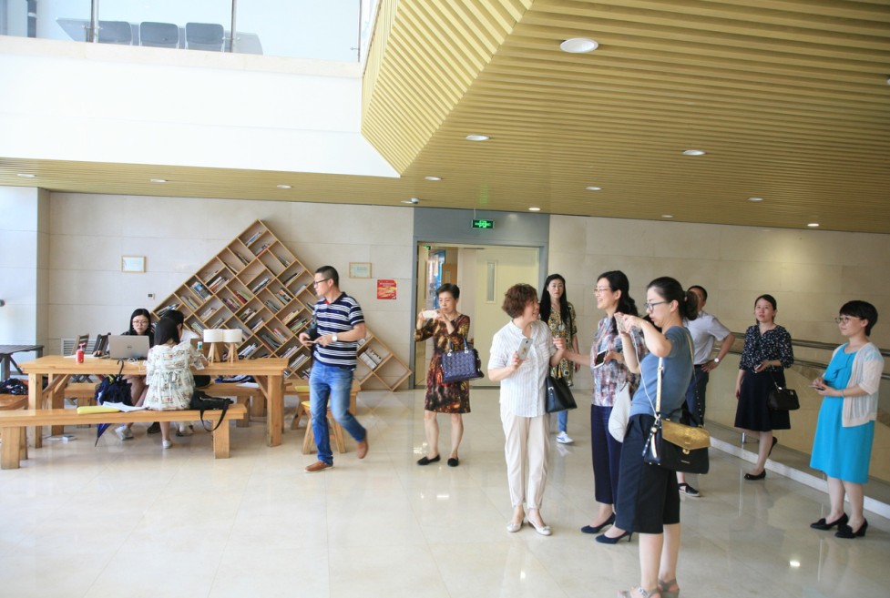 座谈结束后,校工会兼职副主席于晓燕引导与会人员参观了郑东图书馆,大家纷纷在校园中轴线观景台、日新书斋、VR体验区、朗诵亭等区域驻足,兴味盎然。