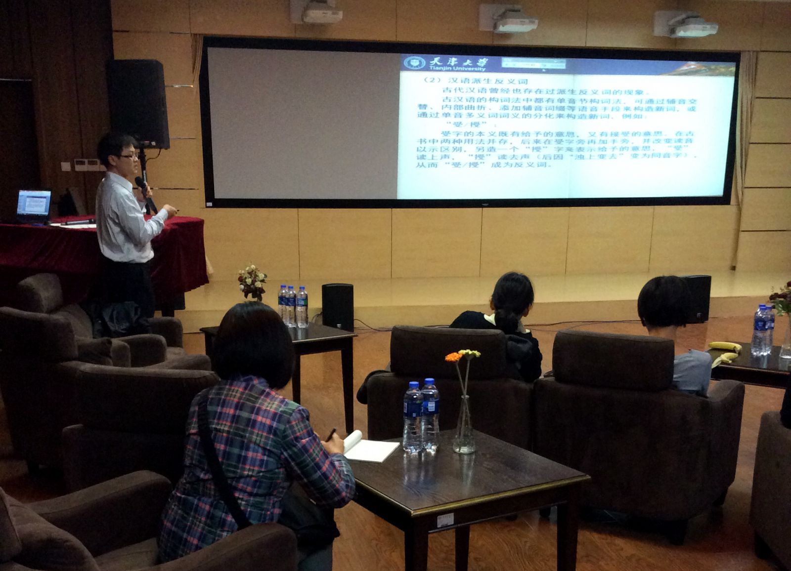 王用源老师从比较语言学、对比语言学、通过英汉词汇的对比考察两种语言的对比、加强中文学科和英文学科的合作四个方面表达了自己的看法。王用源老师着重重叠构词、反义构词、并列构词两个方面分析了中英两种语言的异同。他生动的语言,详实的举例令在场的老师同学领略到了语言的博大精深,并且感受到了中英语言之间巧妙联系。在学术报告接近尾声的时候,王用源老师还提出了在天大这样的工科院校,研究中英文之间的异同同样具有重要的意义。该领域的在解决中英对照软件设计,人工智能等方面都具有良好的发展前景。